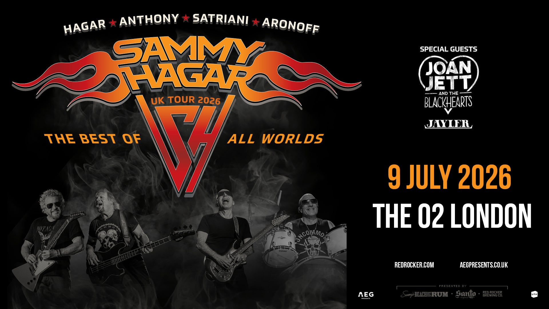 Rock icon Sammy Hagar today announced that his top-grossing Best of All Worlds Tour is headed to the UK for a huge arena tour and appearing at The O2 on Thursday 9 July 2026. The Red Rocker will be joined by his supergroup The Best of All Worlds Band, including legendary guitarist Joe Satriani, fellow Rock & Roll Hall of Famer and longtime Van Halen bassist Michael Anthony, and powerhouse drummer Kenny Aronoff, with special guest Joan Jett & The Blackhearts and opening act JAYLER.